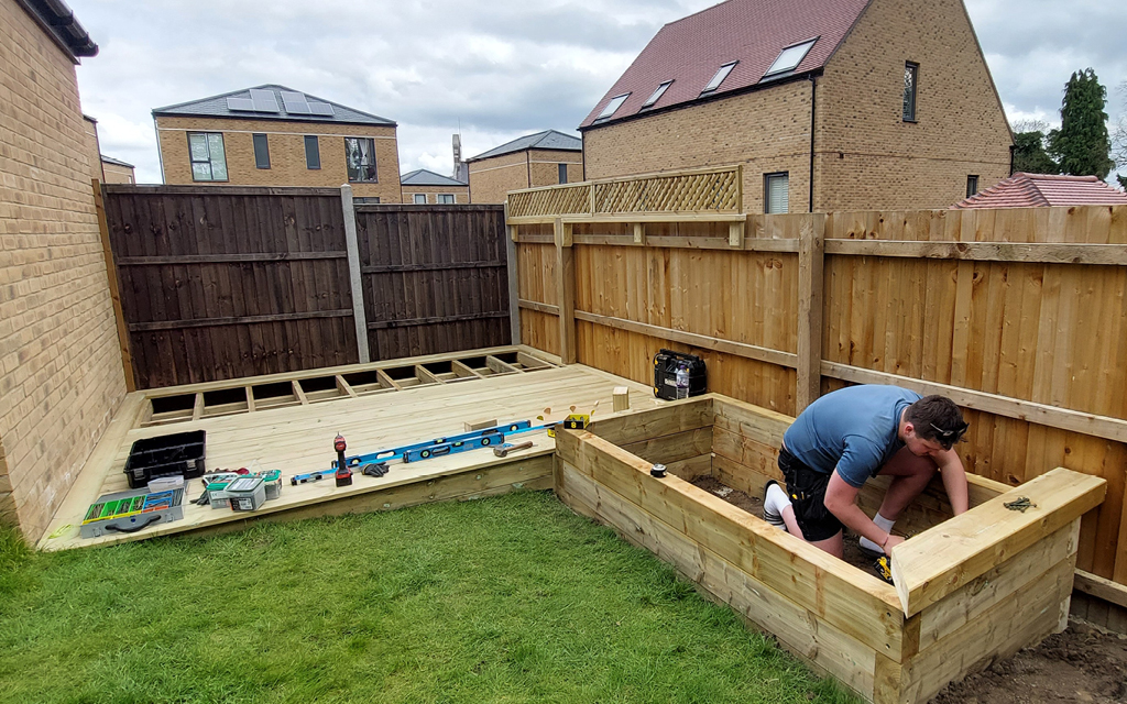Treated Timber decking with sleeper raised bed and trellis fence topper.